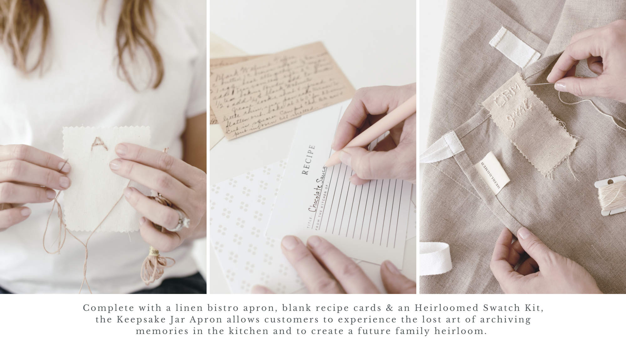 Each apron in a jar is thoughtfully packaged in a vintage-inspired glass jar and includes one of our heirloom-quality aprons, crafted with care from durable linen or cotton blends. Attached to each jar is a recipe hang tag—created so you can record a favorite family recipe made while wearing the apron, turning an everyday kitchen moment into a lasting memory.